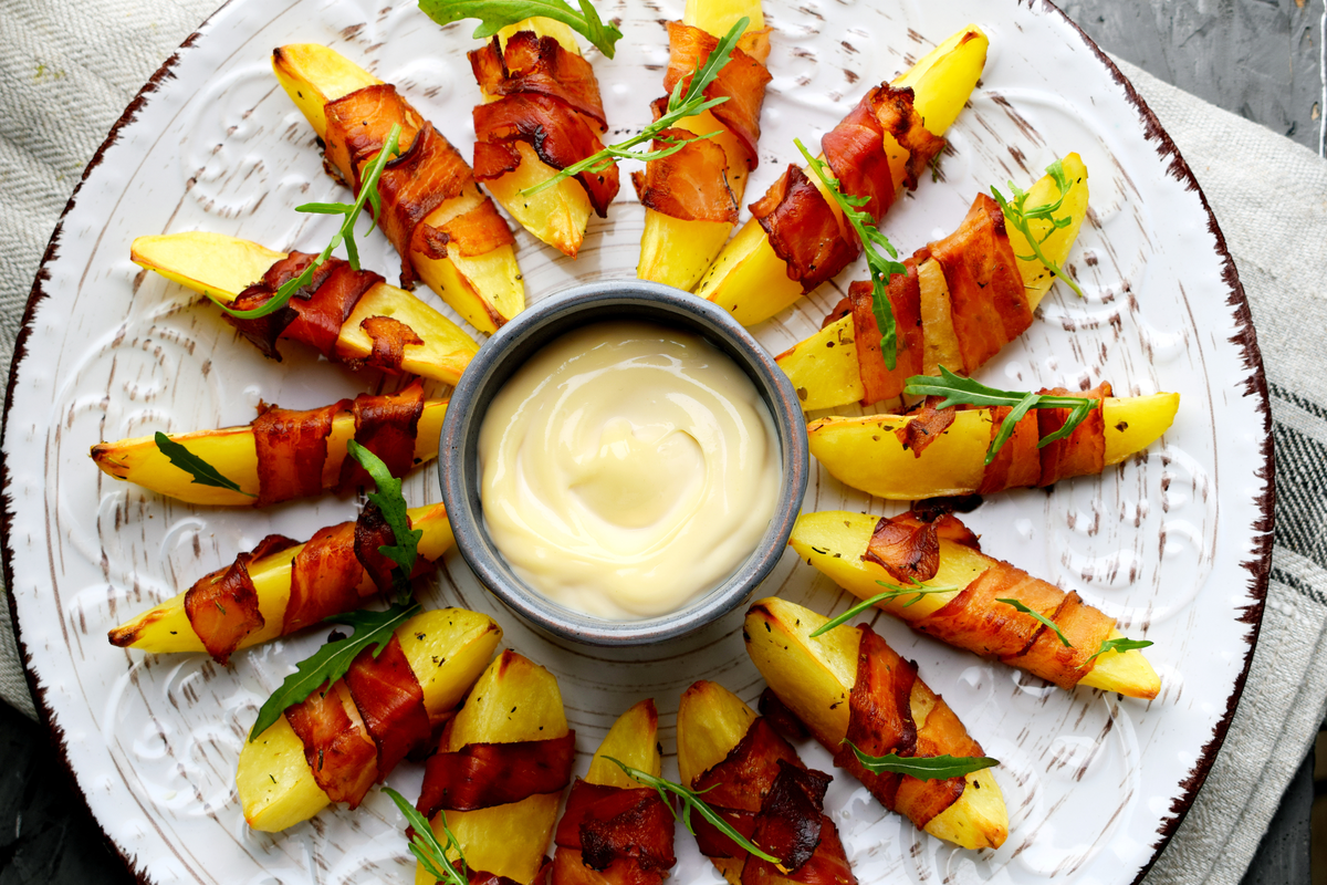 Bacon Wrapped Sweet Potato Wedges with Chilli Lime Mayo